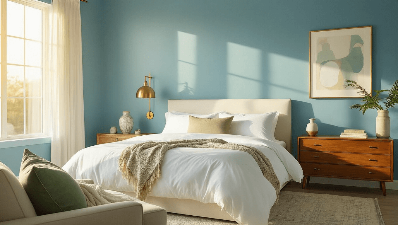 Expansive bedroom with celestial blue walls and warm morning sunlight, featuring a king-sized bed with white linens, vintage brass bedside table, mid-century modern dresser, and abstract wall art, evoking a tranquil luxury atmosphere.