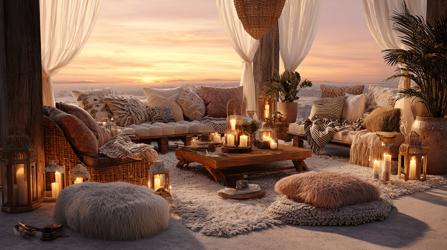A sunset gathering area can make your patio feel warm, inviting, and full of golden charm. Soft seating, glowing lights, and cozy layers are beautiful Boho Patio Ideas for creating a space made for lingering outdoors. Style your sunset setup and start making memories now.