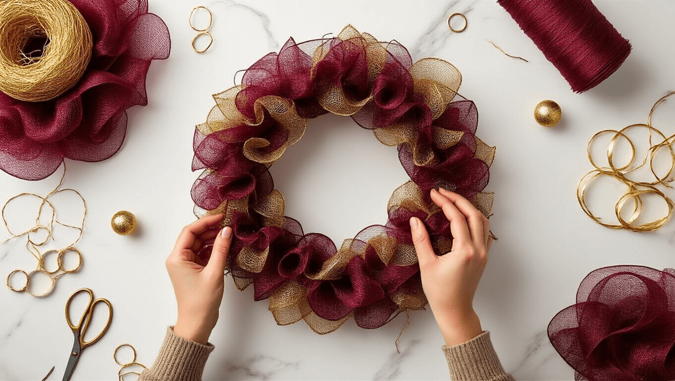Close-up of hands crafting a layered deco mesh wreath on a white marble surface, featuring burgundy and gold mesh with rich textures, a gleaming wire frame, scattered crafting supplies, and warm golden hour lighting, creating a cozy and inviting holiday atmosphere.