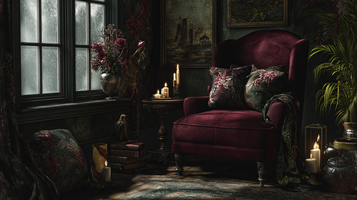 Cozy gothic corners can feel intimate, stylish, and wonderfully comforting when layered with candlelight and rich texture. A velvet chair, dark floral touches, and a small side table create a nook that feels dramatic but still warm and inviting with dark cottagecore appeal. Create your own dark cottagecore corner and make it glow today.