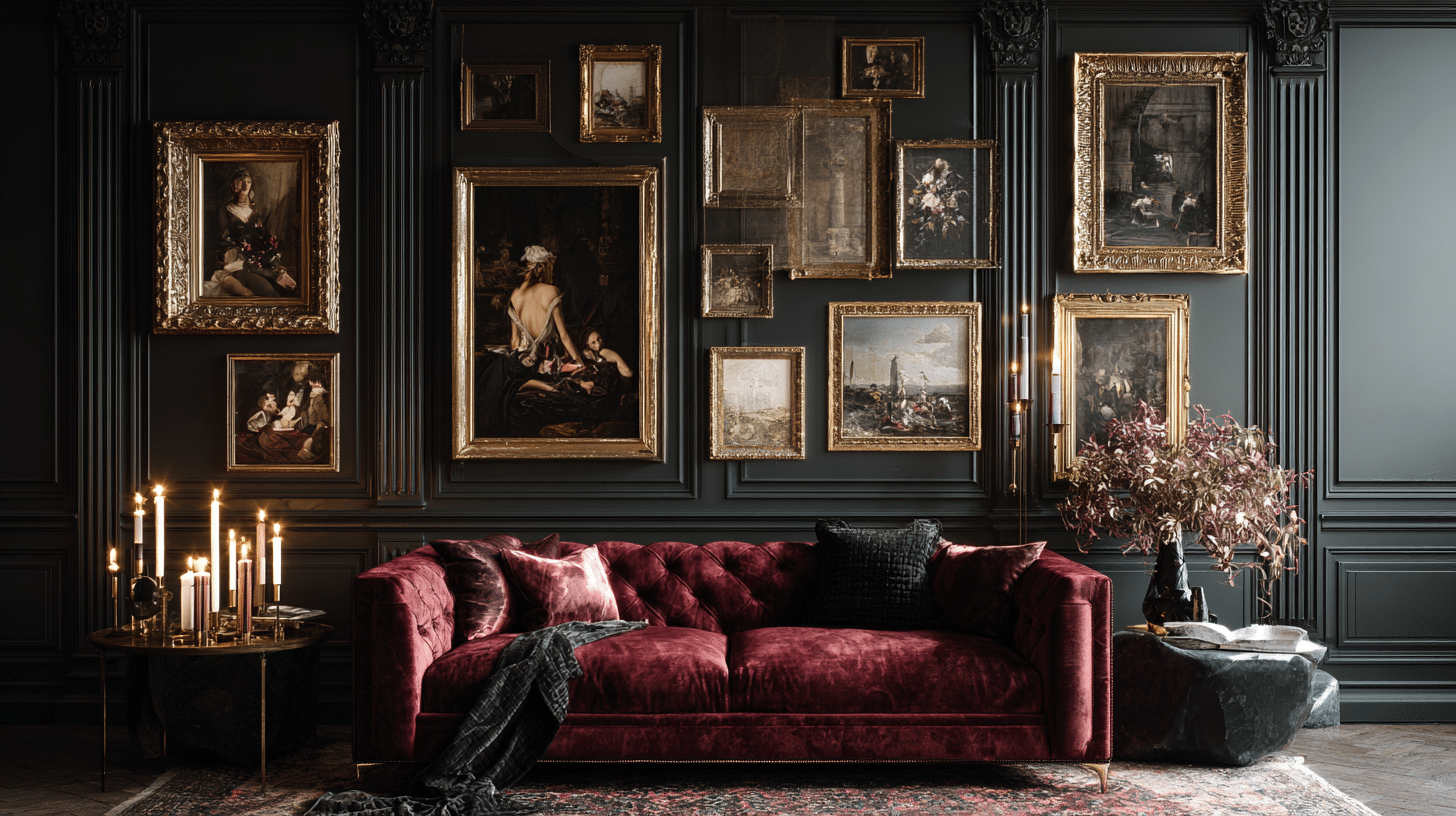 A moody portrait gallery surrounded by ornate frames intensifies the artistry of the dark victorian aesthetic. Dark walls create striking contrast while gold accents add warmth. The arrangement feels cinematic and intentional. Design your own dramatic feature wall using dark victorian aesthetic inspiration now.