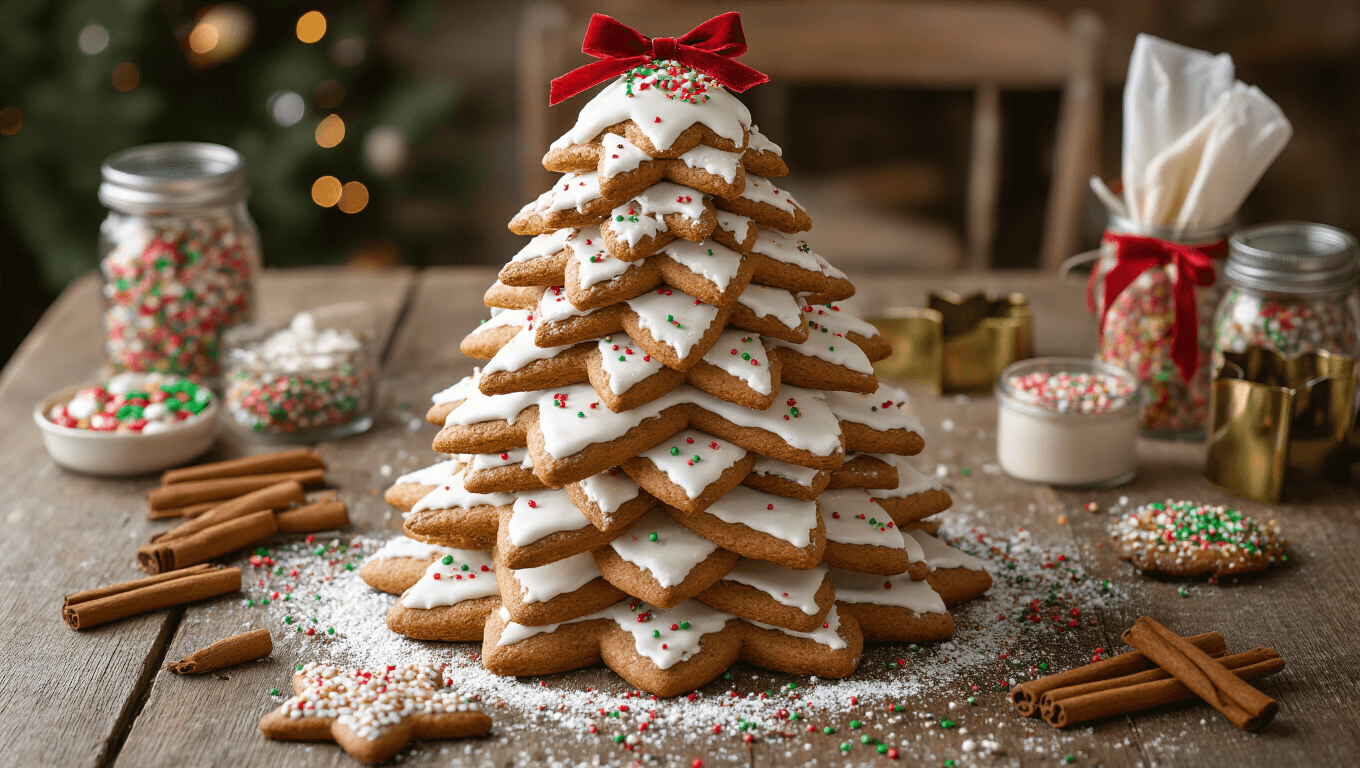 A beautifully crafted edible gingerbread Christmas tree centerpiece on a rustic farmhouse table, featuring graduated star-shaped cookies with royal icing, colorful sprinkles, cinnamon sticks tied with velvet ribbon, and a warm golden hour ambiance.