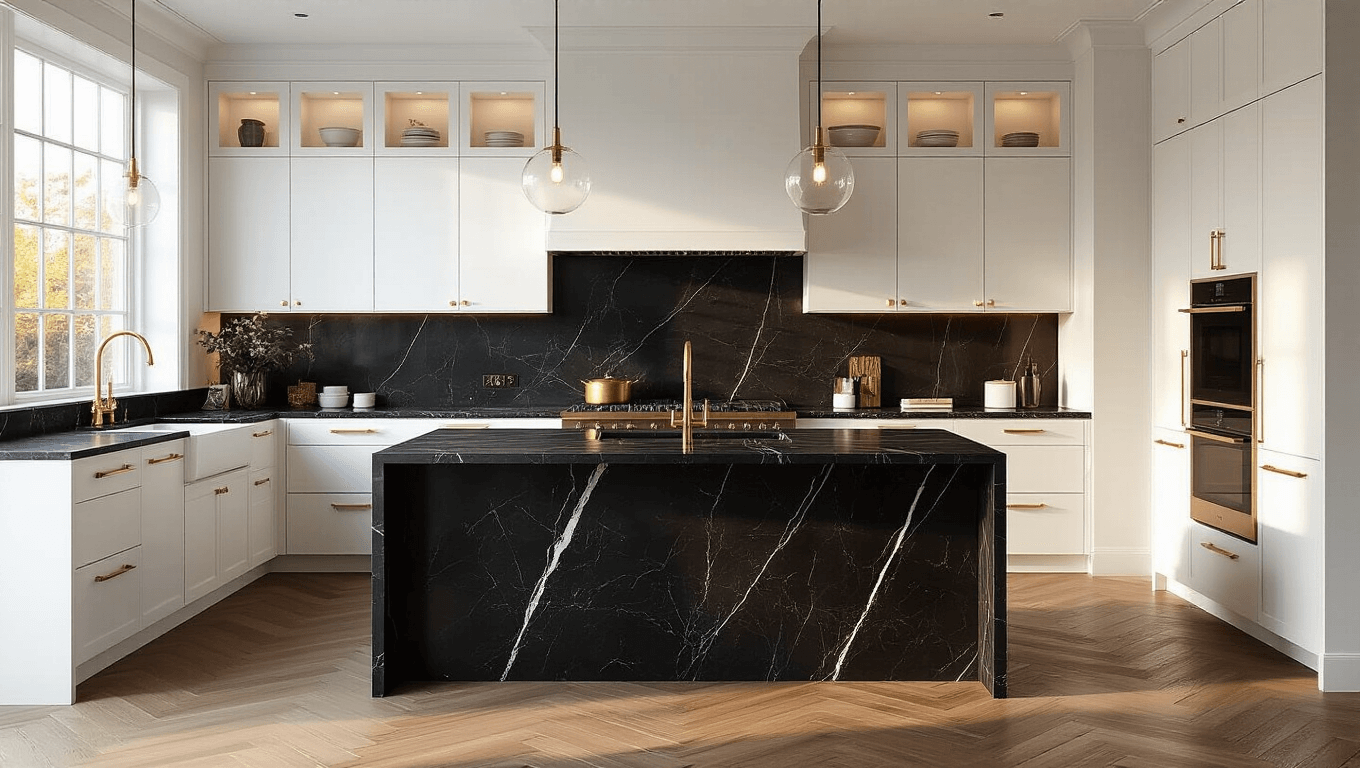 Think of black cabinets framing a white marble island like a piece of jewelry in a velvet box.