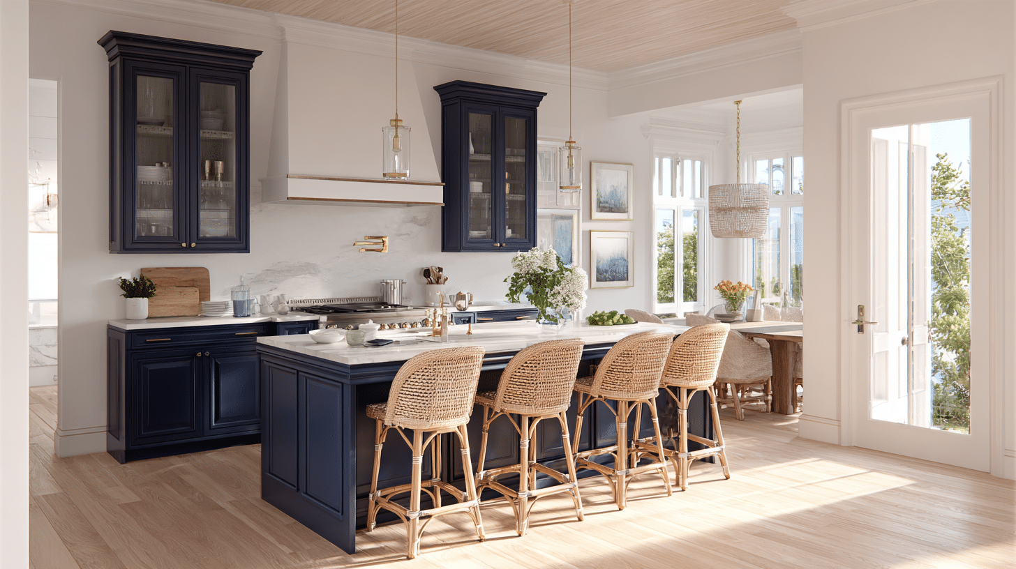 Woven textures and light woods transform navy blue kitchen cabinets into the perfect backdrop for coastal-inspired style. Airy accessories keep the rich tone balanced and relaxed. The result feels breezy yet grounded. Ready to create a calm, vacation-like atmosphere at home? Layer in natural textures.