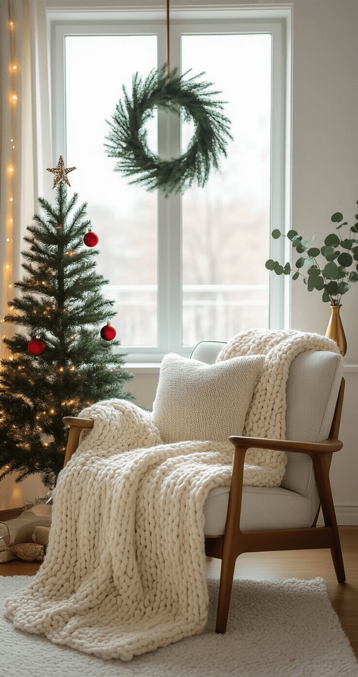 You don’t need to redecorate your entire apartment. Add 2-3 holiday throw pillows in complementary textures—think velvet, chunky knit, or faux fur. Layer a cozy throw blanket across your chair or sofa arm. These soft touches add instant warmth and color without permanent commitment or storage nightmares.