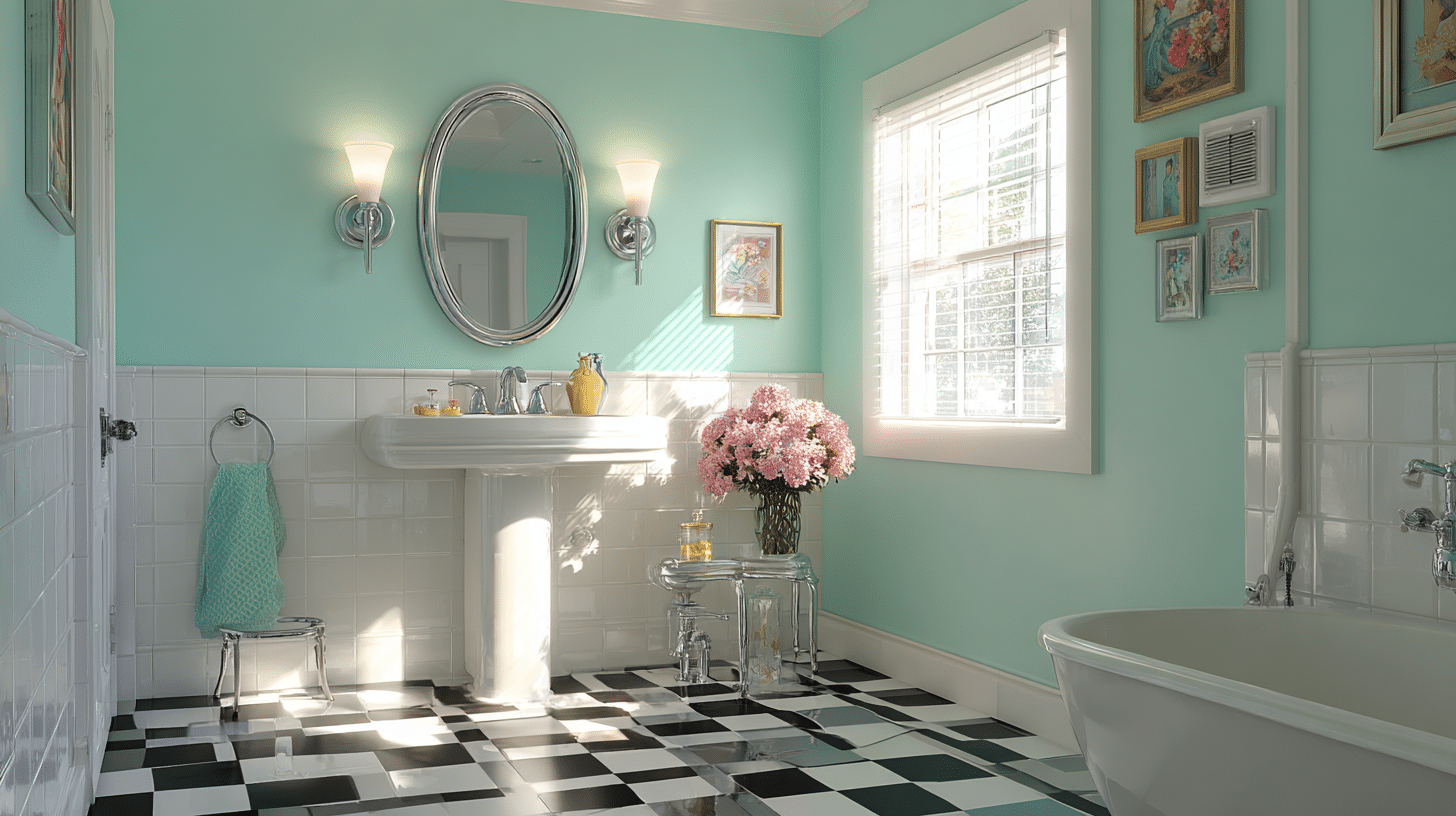 Playful checkerboard flooring and pastel accents bring cheerful retro energy into a lively vintage bathroom. Chrome finishes enhance the brightness and keep the design feeling authentic. The atmosphere is lighthearted and full of personality. Add that nostalgic spark to your bathroom today.