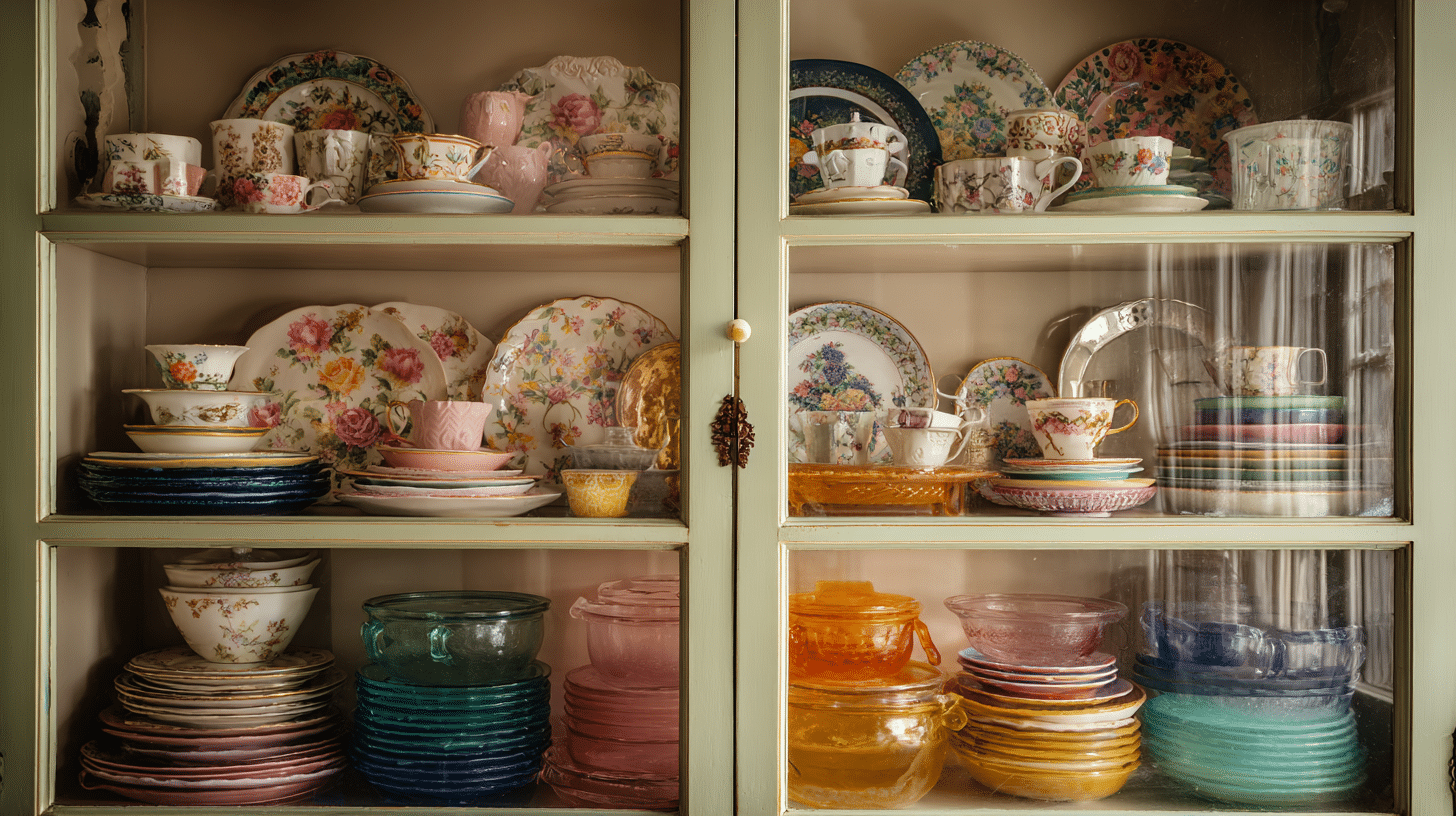 A beautiful dish cabinet can add instant charm and personality to your vintage kitchen. Favorite plates, teacups, and colorful pieces create a cheerful display that feels collected and warm. Show off the pieces you love and make your cabinet a standout feature now.