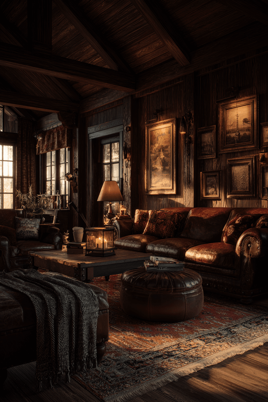 Bold ranch gothic living transforms rustic interiors with Western Gothic Aesthetic drama. Dark wood and soft textiles create a strong yet welcoming atmosphere. Redefine your living space with this bold style today.