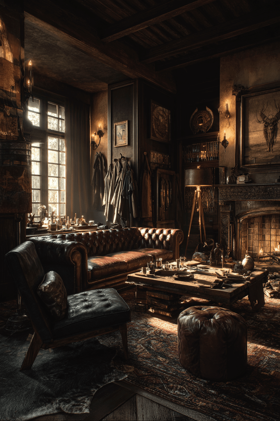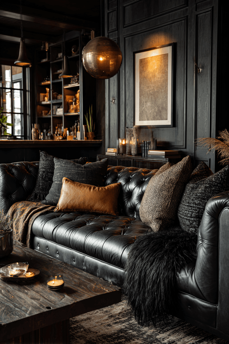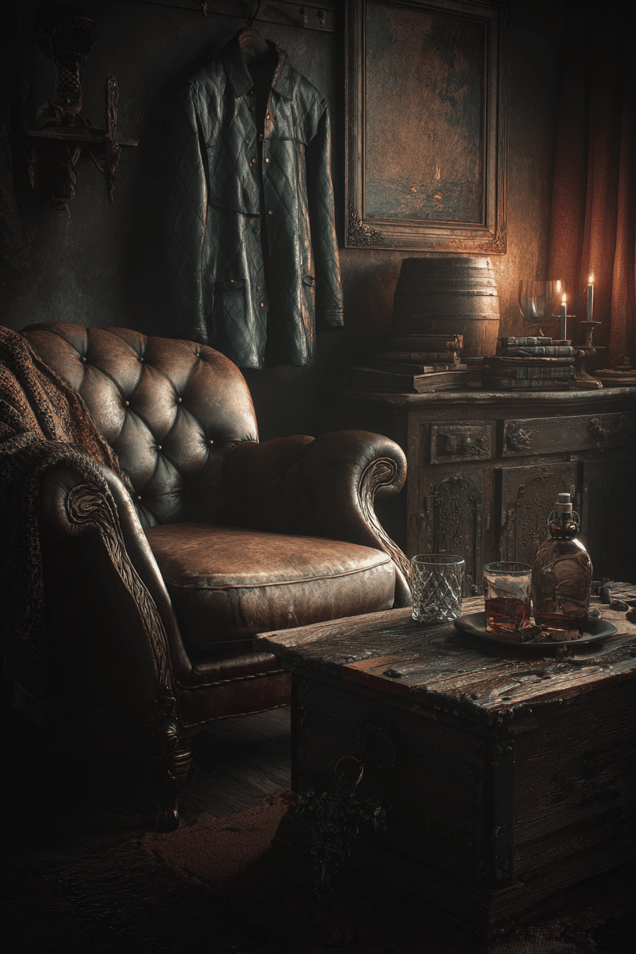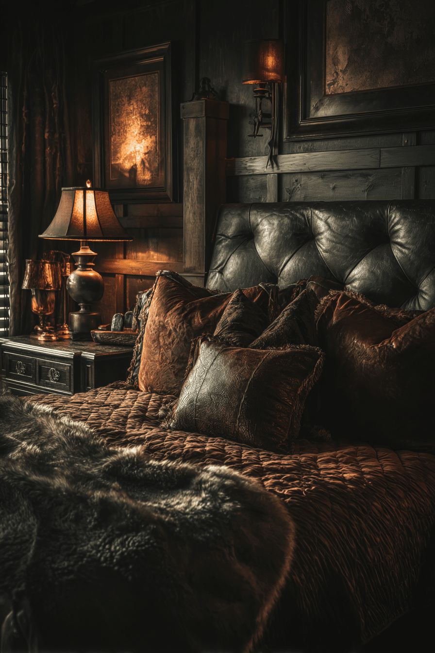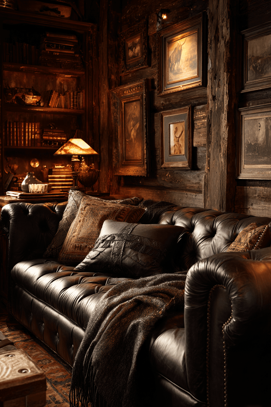 Strong leather cozy balance highlights Western Gothic Aesthetic with bold materials and soft comfort. Rustic elements blend seamlessly with warm lighting for a balanced look. Bring this harmony into your space today.