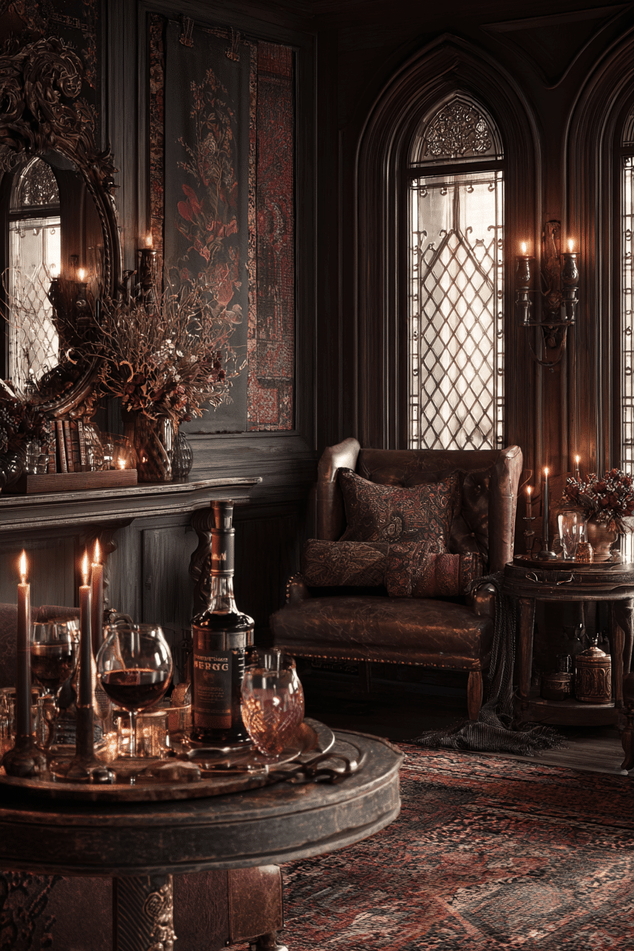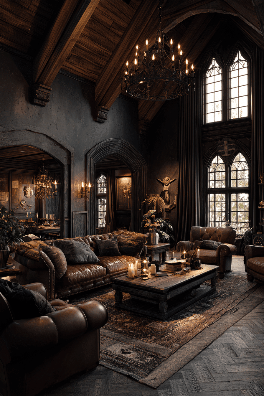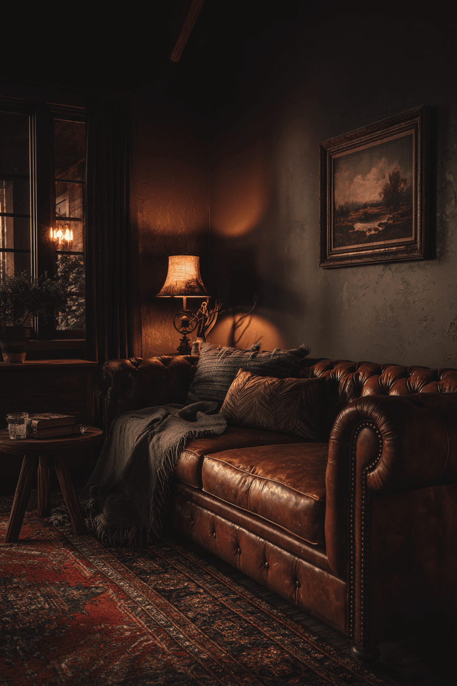 Elegant luxe cozy living blends comfort and refinement through Western Gothic Aesthetic. Rich textures and soft lighting create a warm sophisticated vibe. Elevate your living space today.