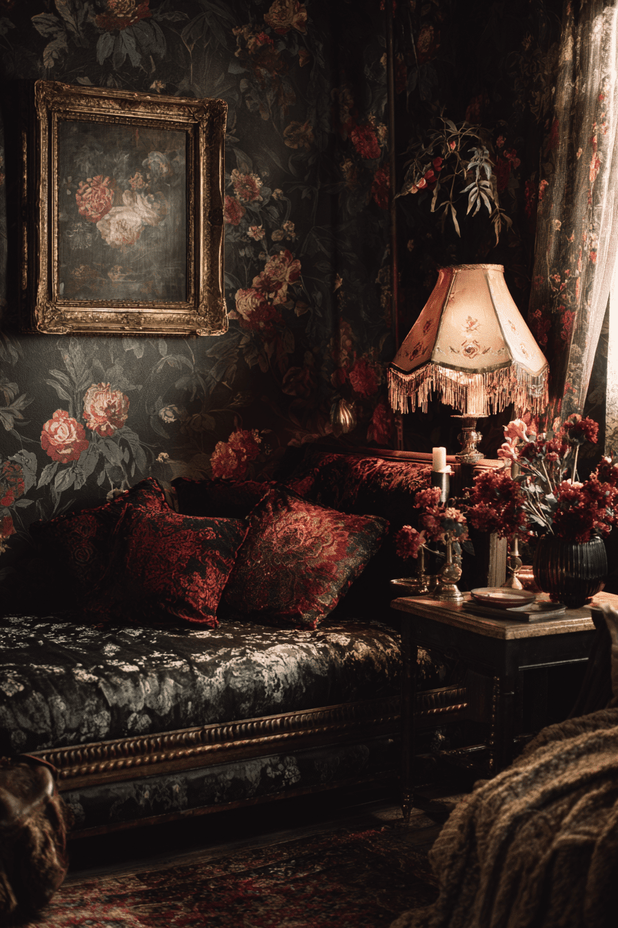 Soft romantic floral mood adds contrast to Western Gothic Aesthetic with delicate patterns. Dark florals soften bold elements while keeping the look cohesive. Add this romantic detail to your decor today.