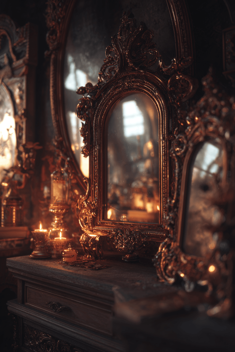 Bright elegant mirror style enhances Western Gothic Aesthetic by reflecting light and opening the space. Vintage frames add charm while balancing darker tones. Refresh your space with mirrors today.