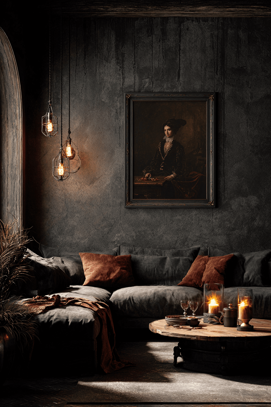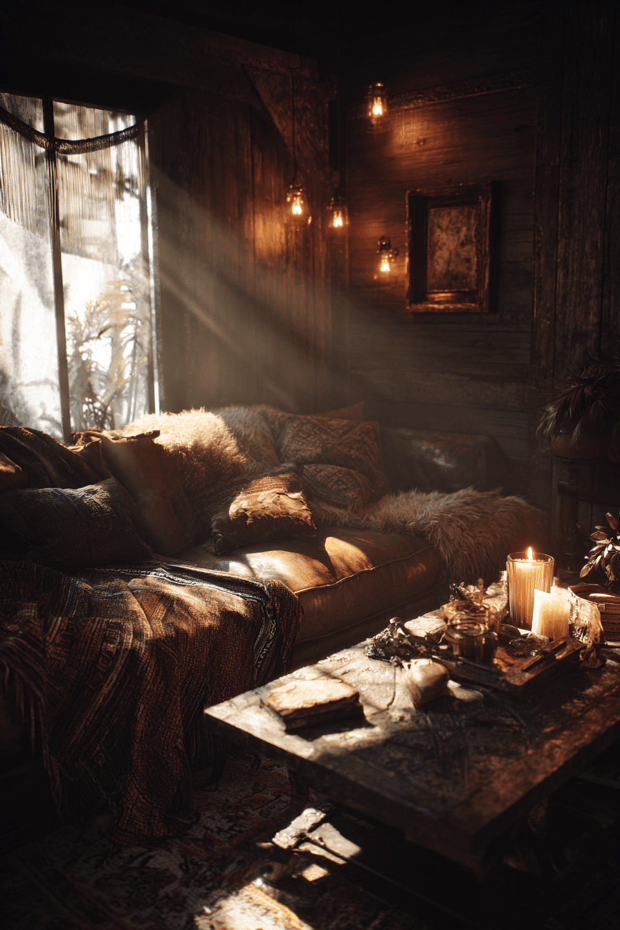 Striking dark cozy escape energy defines this Western Gothic Aesthetic with deep tones and soft layered textures. Rich wood and ambient lighting create a space that feels bold yet comforting. Turn your home into this cozy escape today.