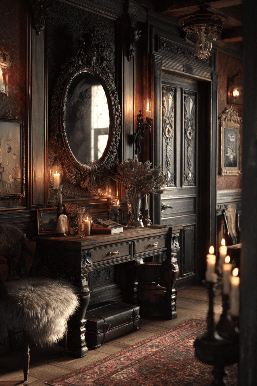 Inviting entryway gothic style sets the tone with Western Gothic Aesthetic charm. Dark wood and vintage details create a welcoming yet bold entrance. Refresh your entryway today.
