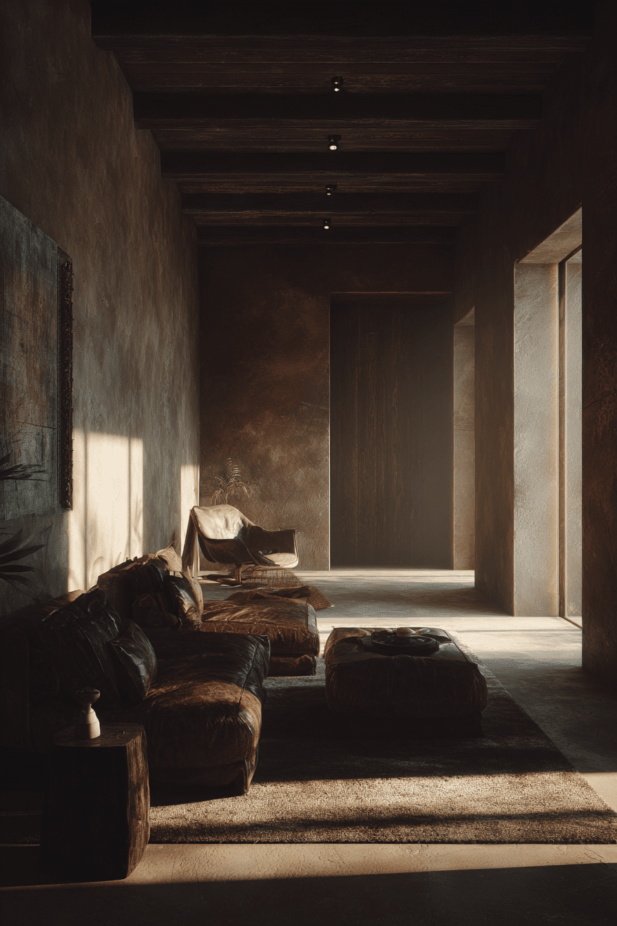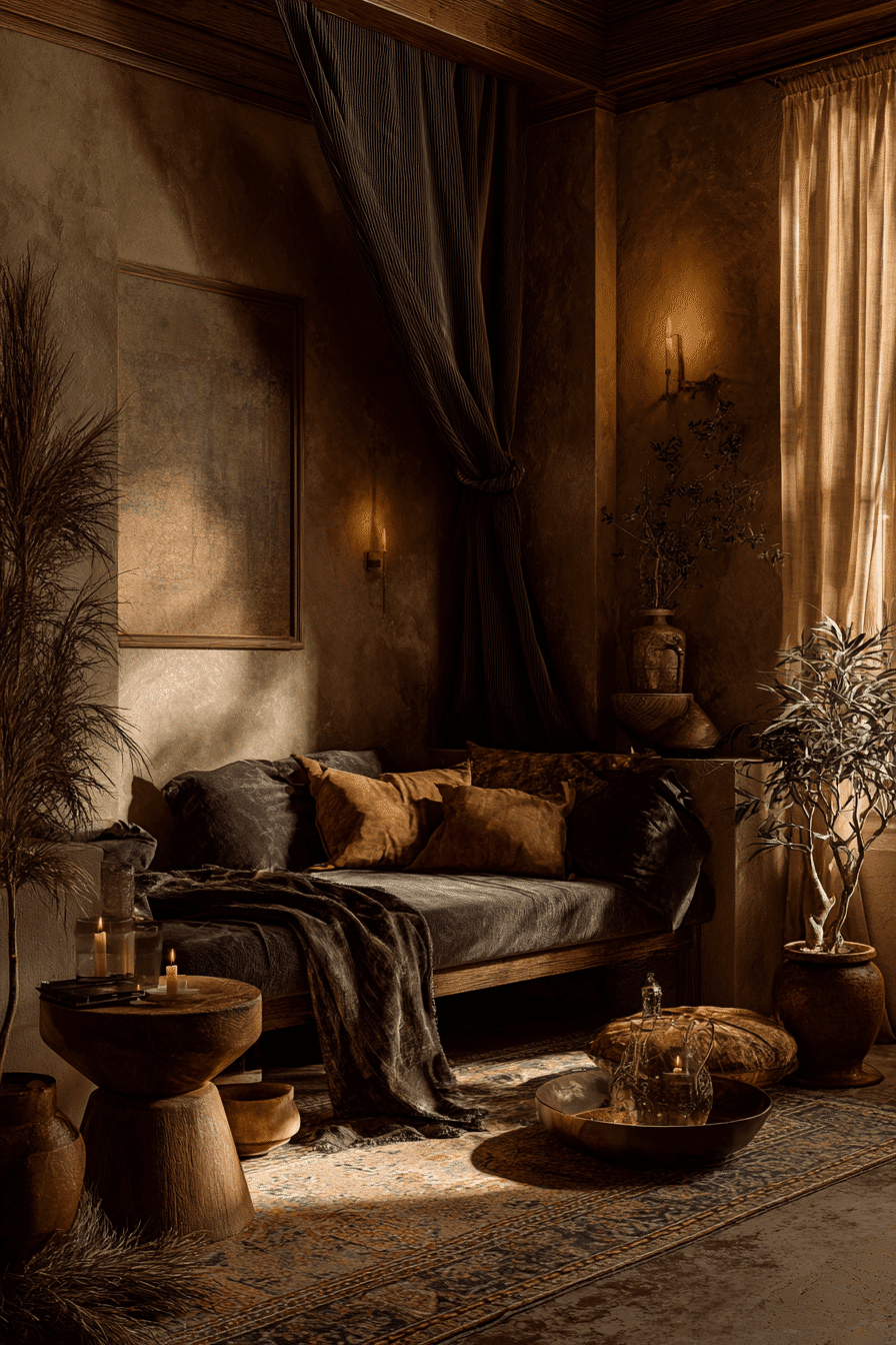 Dreamy desert moody retreat captures Western Gothic Aesthetic with warm earth tones and dark accents. Cozy textures and soft lighting create an inviting atmosphere. Design your dreamy retreat today.