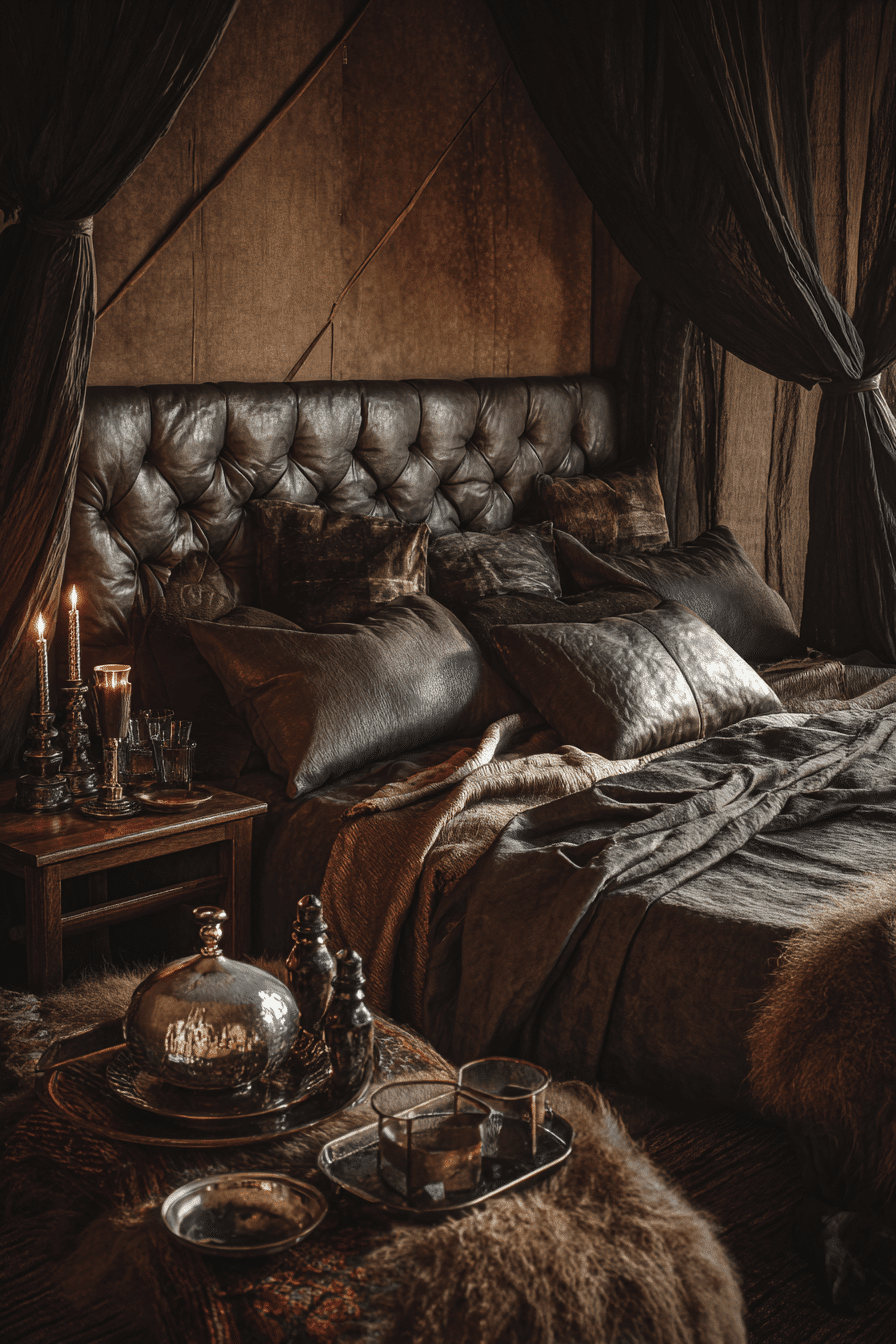 Calm moody bedroom haven turns your space into a restful retreat with Western Gothic Aesthetic. Soft lighting and plush layers create comfort and serenity. Transform your bedroom into a haven today.