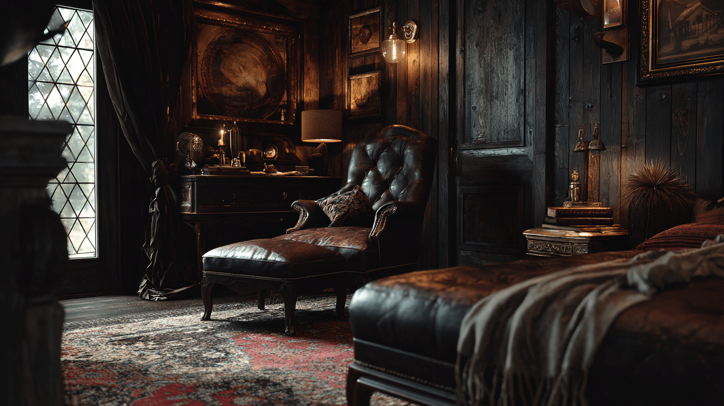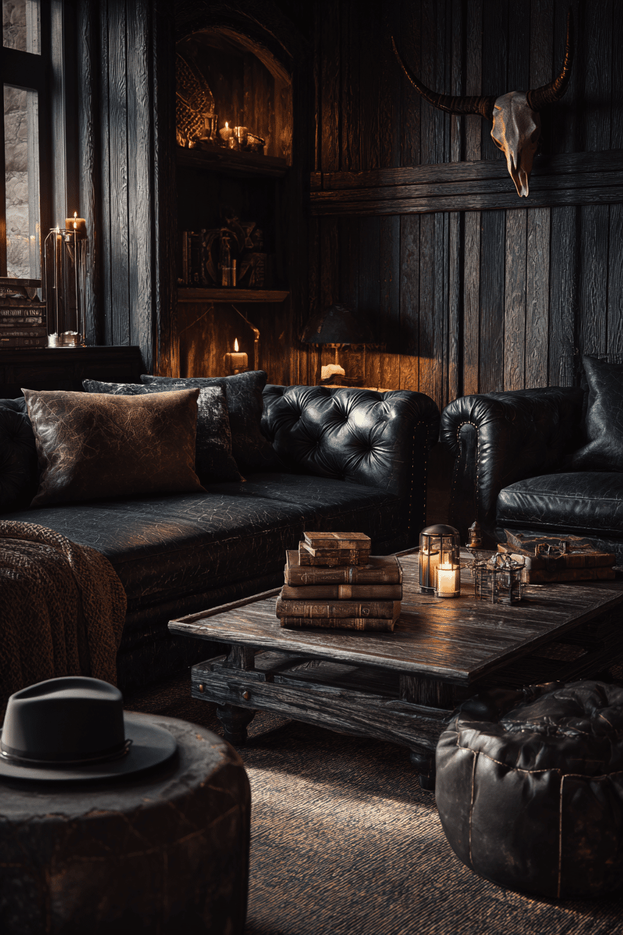 Strong leather cozy balance highlights Western Gothic Aesthetic with bold materials and soft comfort. Rustic elements blend seamlessly with warm lighting for a balanced look. Bring this harmony into your space today.